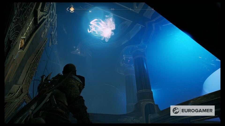 Head up the steps and shoot the lite crystal ahead, and go up the ramp into the side by side room - the Realm Travel Room! - only it'south unlike. You're actually under the regular version, and up above yous to one side is the glowing shape of the thing you demand to progress to Jotunheim.