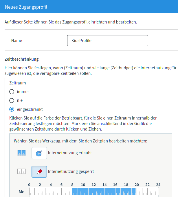 Danach: Zeitraum eingeschränkt: auf Internetnutzung gesperrt klicken. Und nun kannst die Zeiten einstellen.